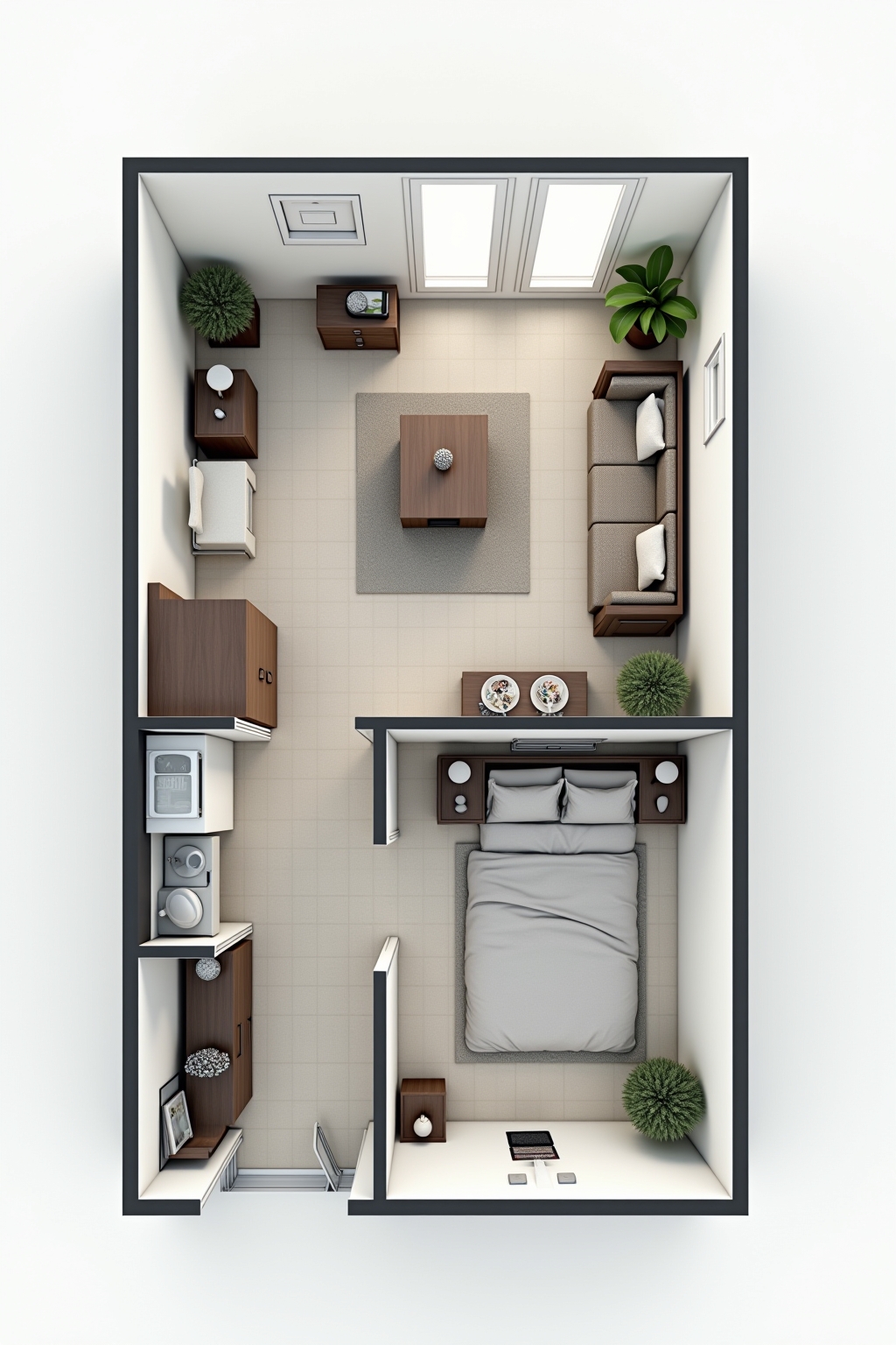 Die Zoneneinteilung ist bei kleinen Appartements entscheidend. Nutzen Sie Raumteiler wie offene Regale, die als Stauraum und gleichzeitig als visuelle Trennung dienen. Paravent-Elemente schaffen einen abgegrenzten Schlafbereich. Unterschiedliche Teppiche markieren optisch verschiedene Wohnzonen. Eine Küchentheke oder ein schmaler Esstisch können als natürliche Abgrenzung zwischen Koch- und Wohnbereich fungieren. Bei der Miniatur-Raumplanung helfen auch Farbakzente: Unterschiedliche Wandfarben oder Beleuchtungskonzepte unterstützen die Wahrnehmung separater Bereiche, ohne das Studio durch massive Trennwände zu verkleinern.