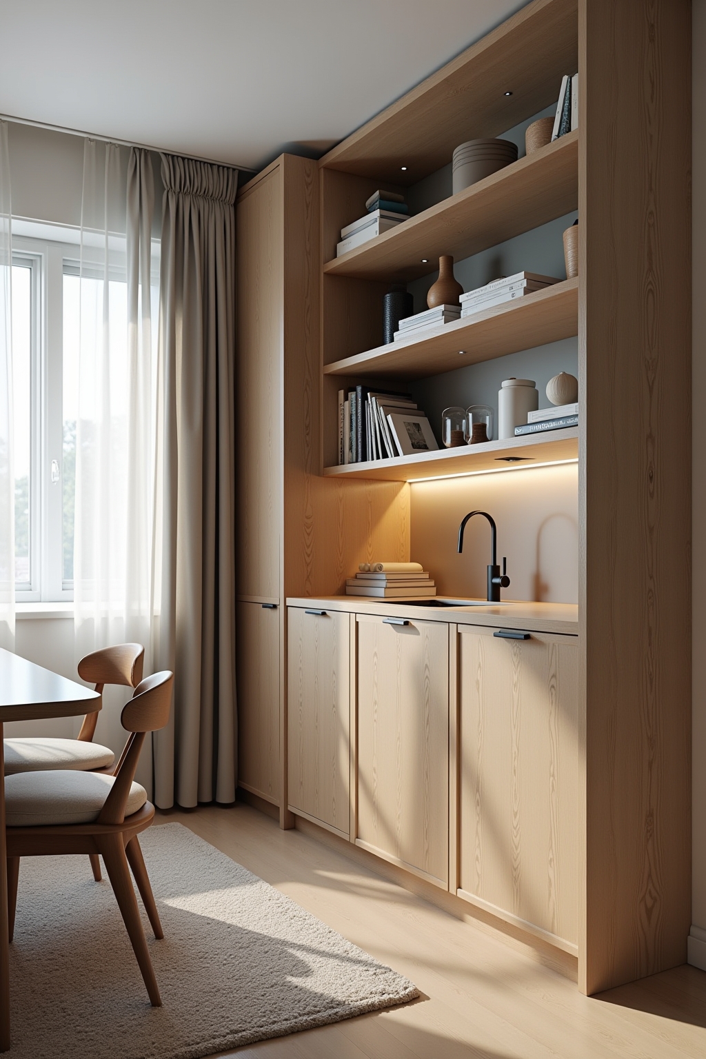 Raumteiler: Setze Regale, Vorhänge oder niedrige Kommoden als optische Trennung ein, die gleichzeitig Stauraum bieten.