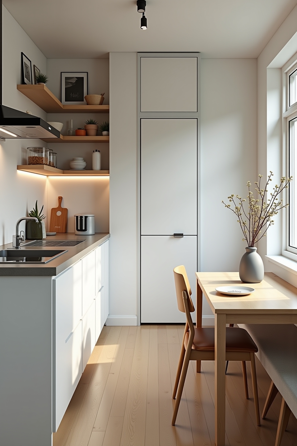 In einer 1-Zimmer-Wohnung mit 30 Quadratmetern ist die intelligente Kombination von Küche und Essbereich entscheidend für eine funktionale Raumnutzung. Ein schmaler Klapptisch an der Wand spart wertvollen Platz und lässt sich bei Bedarf schnell ausklappen, wenn Gäste zu Besuch kommen. Multifunktionale Möbel wie eine Küchenzeile mit integriertem Bartresen können gleichzeitig als Arbeitsplatte und Esstisch dienen und schaffen so eine nahtlose Verbindung zwischen Kochen und Essen. Für zusätzlichen Stauraum sorgen clevere Lösungen wie Hängeschränke bis zur Decke und magnetische Gewürzhalter, die die vertikale Raumnutzung optimieren.