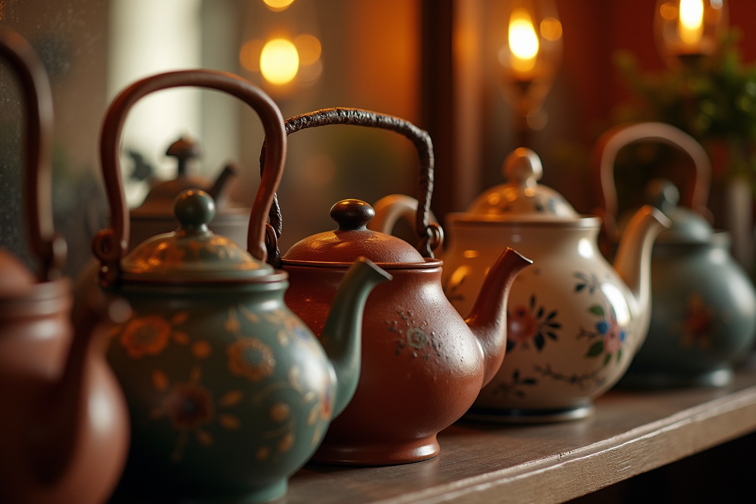 Größen staffeln: Platziere große Teekannen als Ankerpunkte und ergänze sie mit kleineren Stücken für ein harmonisches Gleichgewicht.