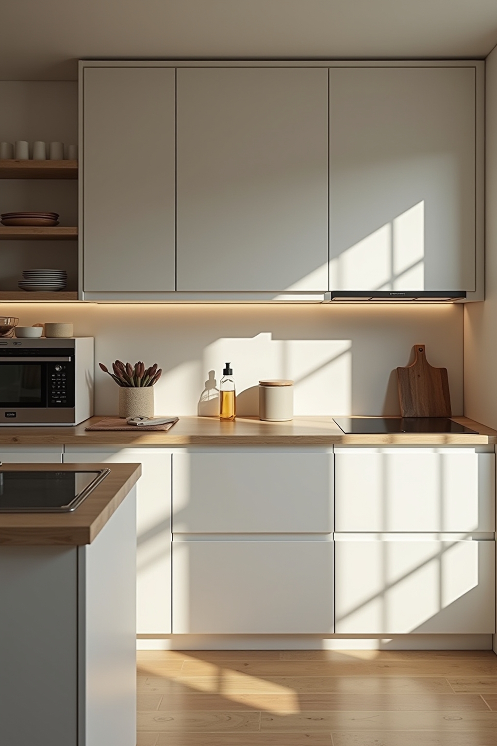 Ein durchdachtes Beleuchtungskonzept ist für Mini-Kochzonen essentiell und basiert auf drei Ebenen: Als Grundbeleuchtung dienen flache Deckenleuchten, die den gesamten Raum erhellen ohne optisch aufzutragen. Arbeitsbeleuchtung in Form von LED-Streifen unter Oberschränken sorgt für schattenfreies Licht auf der Arbeitsfläche. Akzentbeleuchtung in Vitrinenschränken oder als indirekte Beleuchtung über Oberschränken schafft Tiefe und Atmosphäre. Besonders effektiv sind dimmbare Leuchten, die flexibel an verschiedene Tätigkeiten angepasst werden können. Helle, neutralweiße Lichttemperaturen (um 4000 Kelvin) bieten gute Farbwiedergabe beim Kochen, während wärmeres Licht gemütliche Stimmung für Mahlzeiten schafft. Spiegel oder glänzende Oberflächen verstärken den Lichteffekt zusätzlich und lassen den Küchenbereich großzügiger wirken.