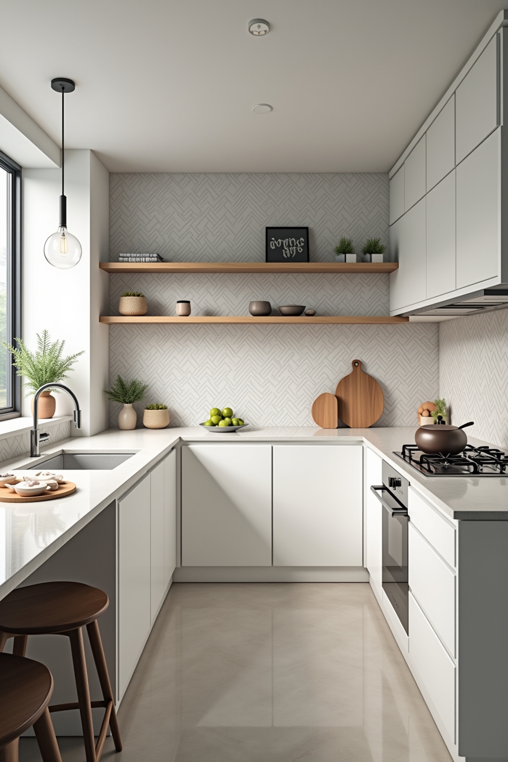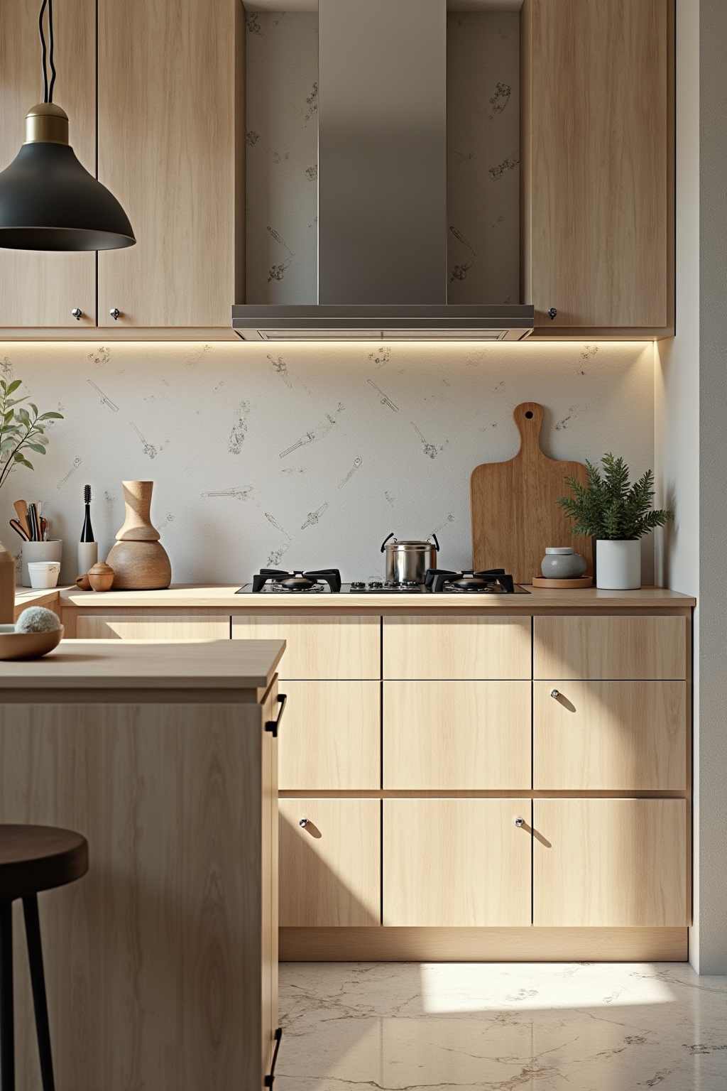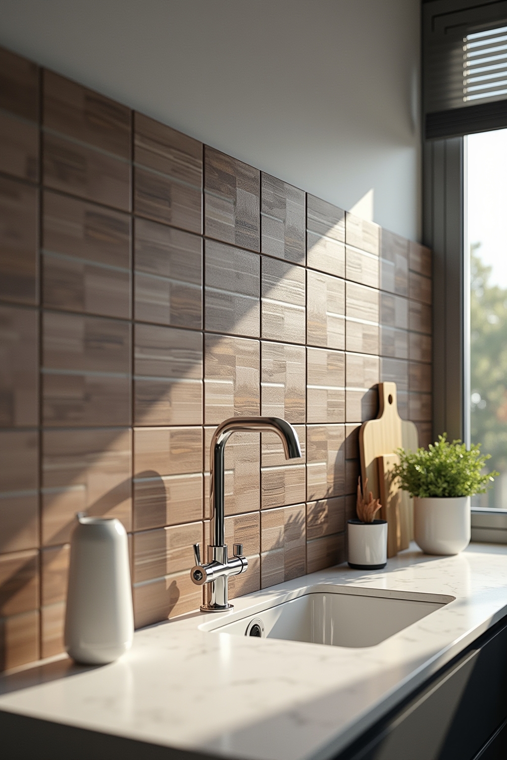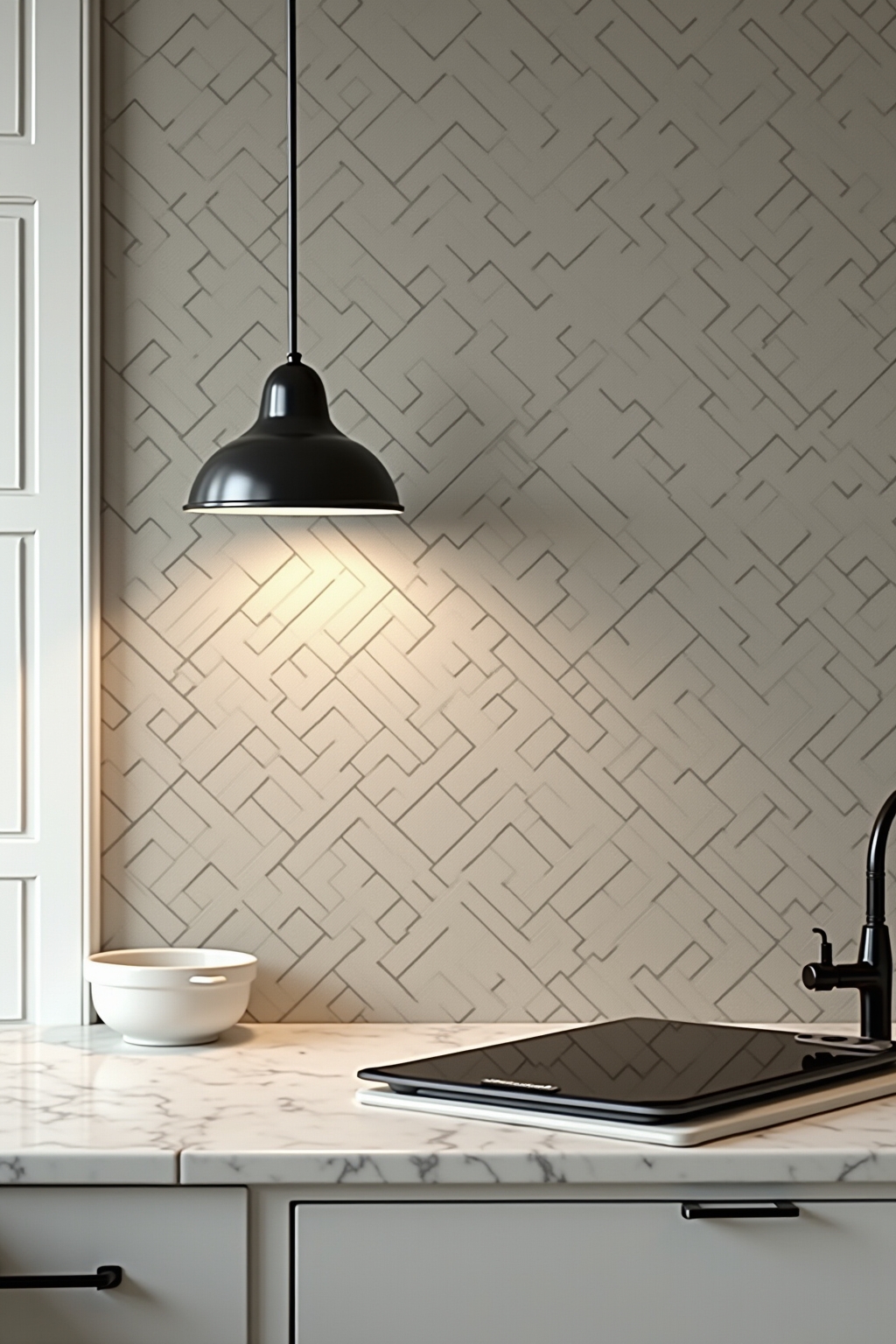 Akzentbereich: Ein besonderes Fliesenmuster am Spritzschutz setzt wirkungsvolle Akzente, ohne den Raum zu überladen.