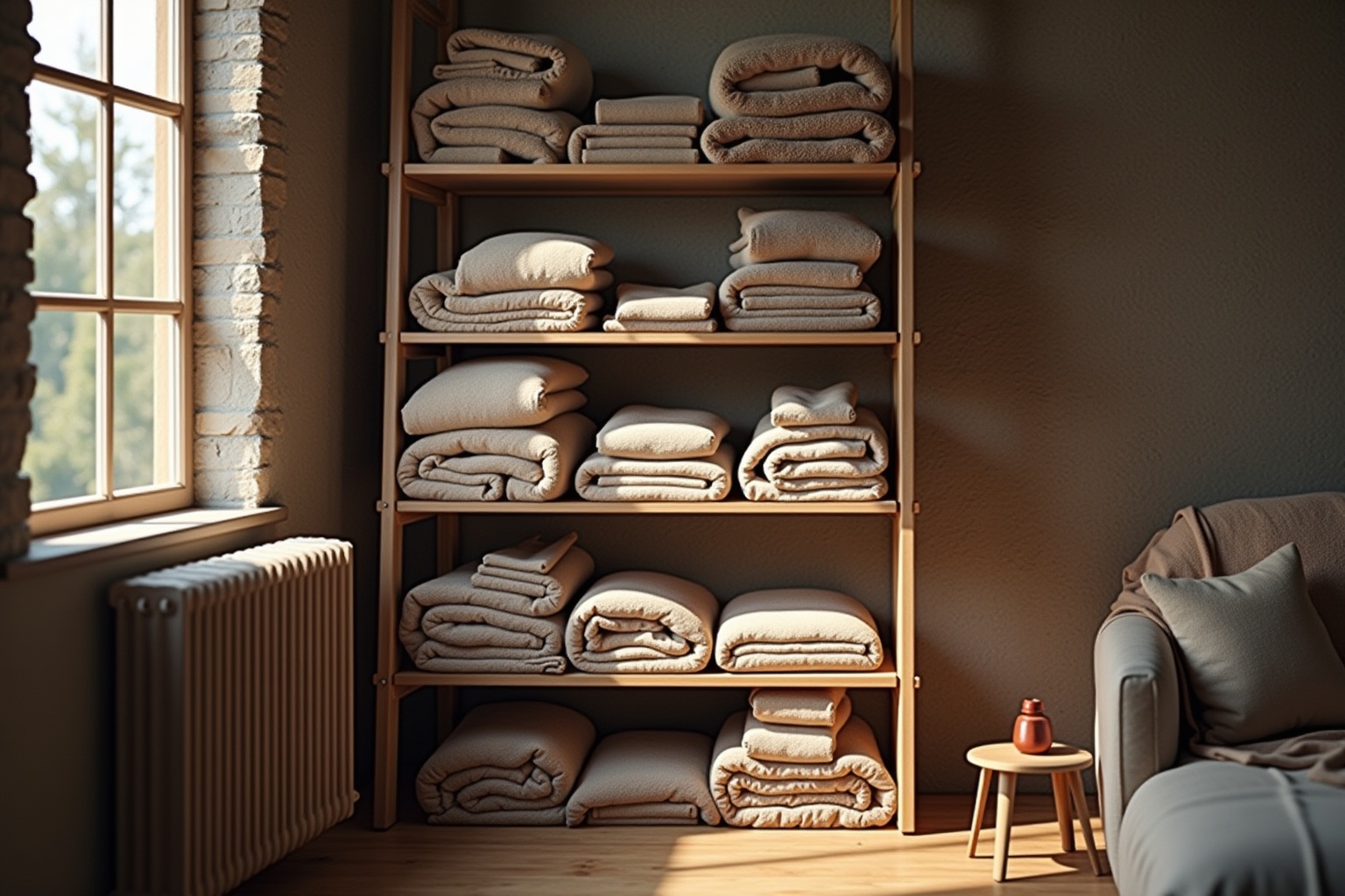 Platzsparend und dekorativ: Decken ordentlich im Leiterregal verstauen