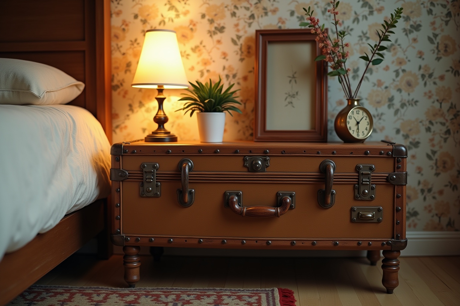 Wie lässt sich ein alter Koffer als Nachttisch optisch in das Schlafzimmer integrieren?